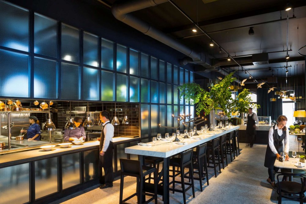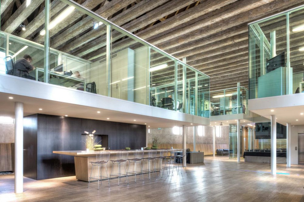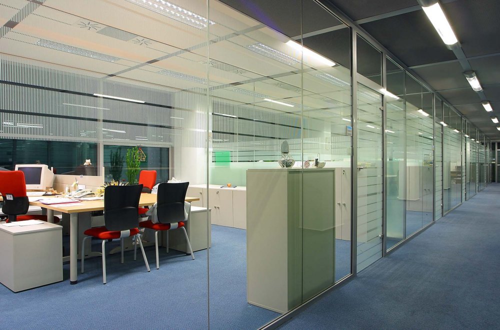 Bezpečnostní sklo Stratobel Linea Azzurra použité jako dělicí příčky