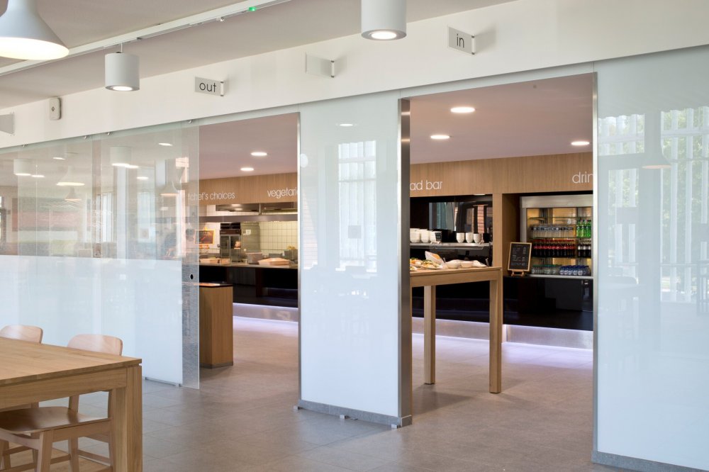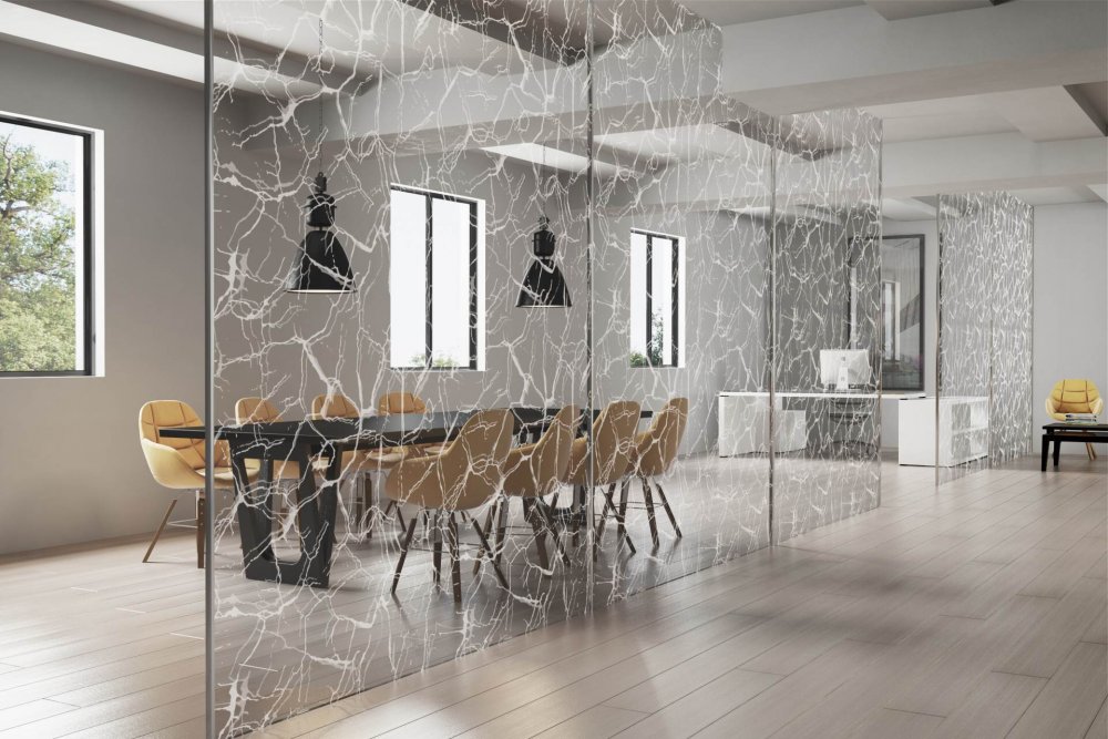 Sklo s potiskem Artlite použité na dveřích a příčkách