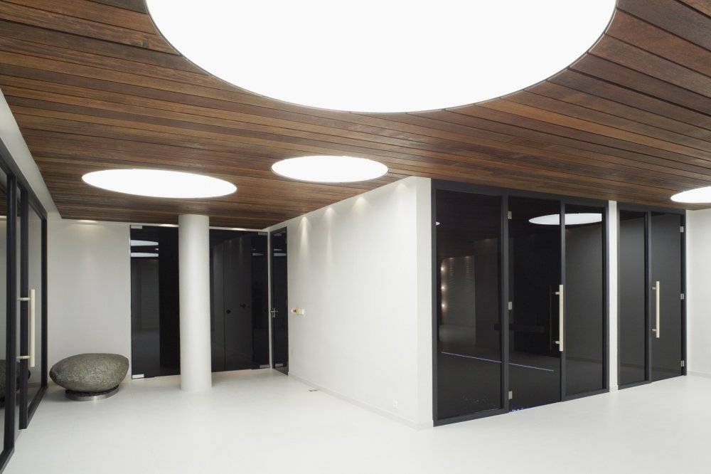 Celoskleněné dveře a příčky z bezpečnostního skla Stratobel Dark Grey