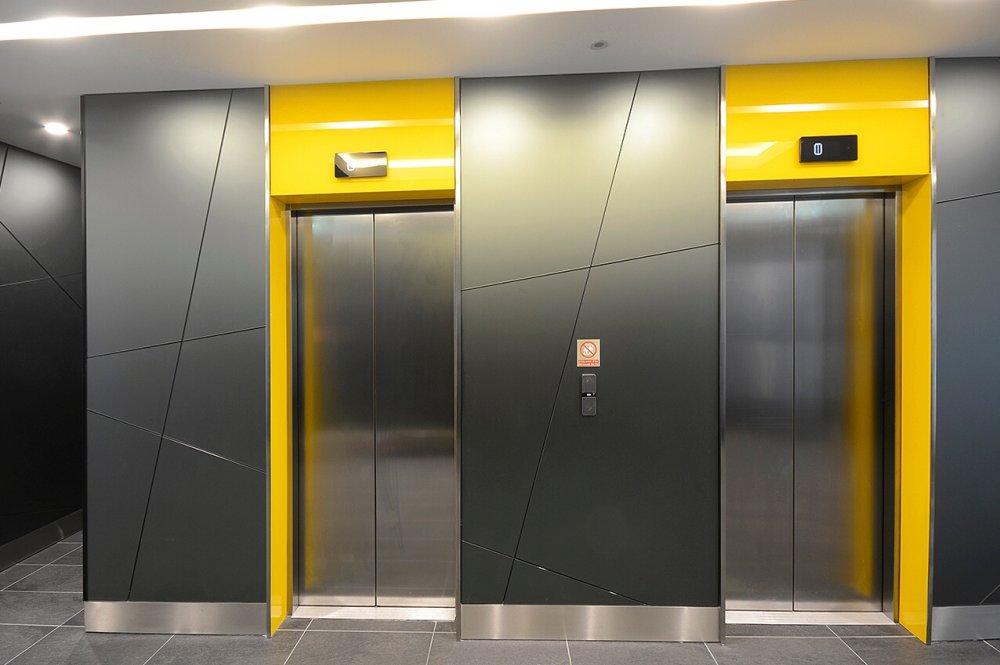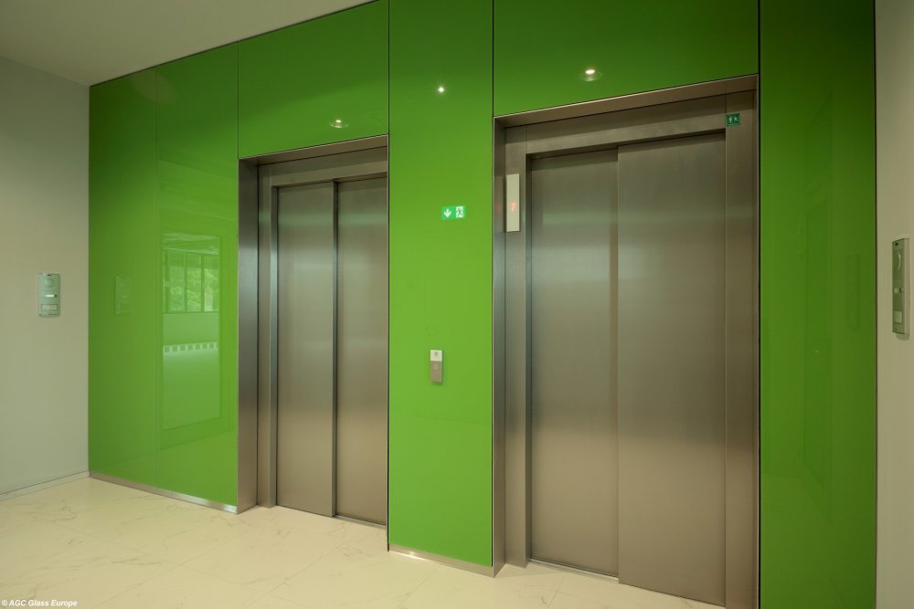 Skleněný obklad výtahů se skly Lacobel Green Luminous
