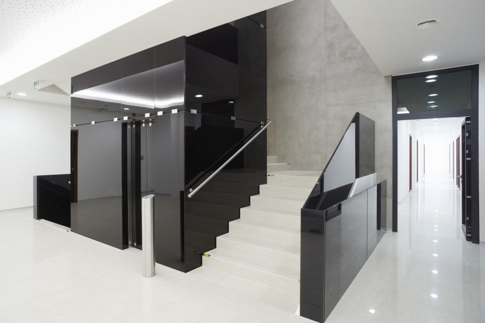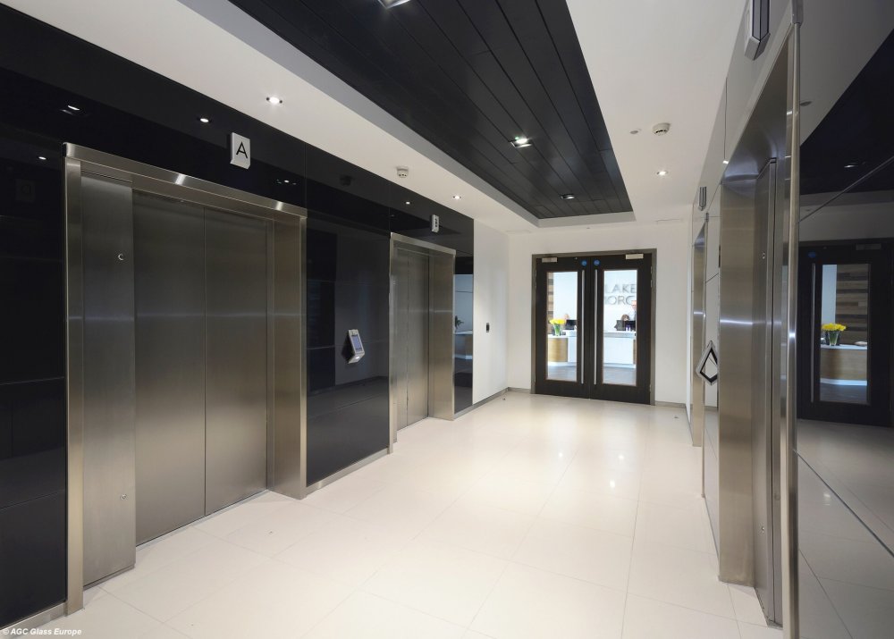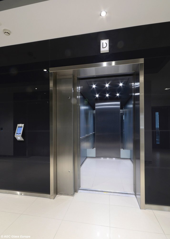Skleněný obklad kolem výtahů Lacobel Antracite Authentic