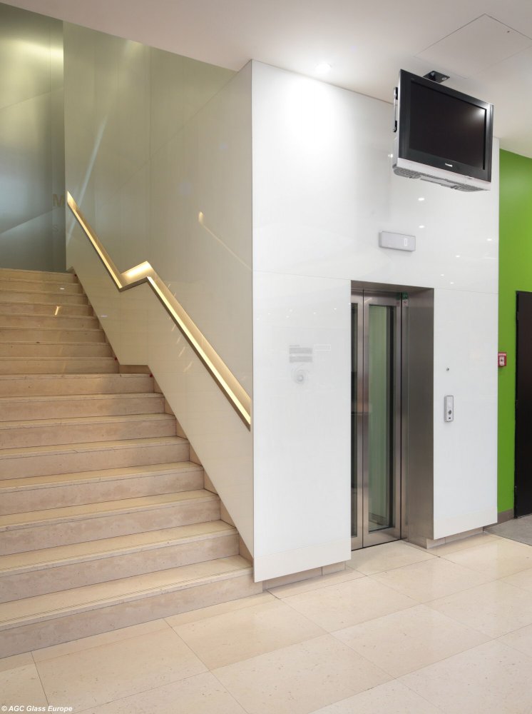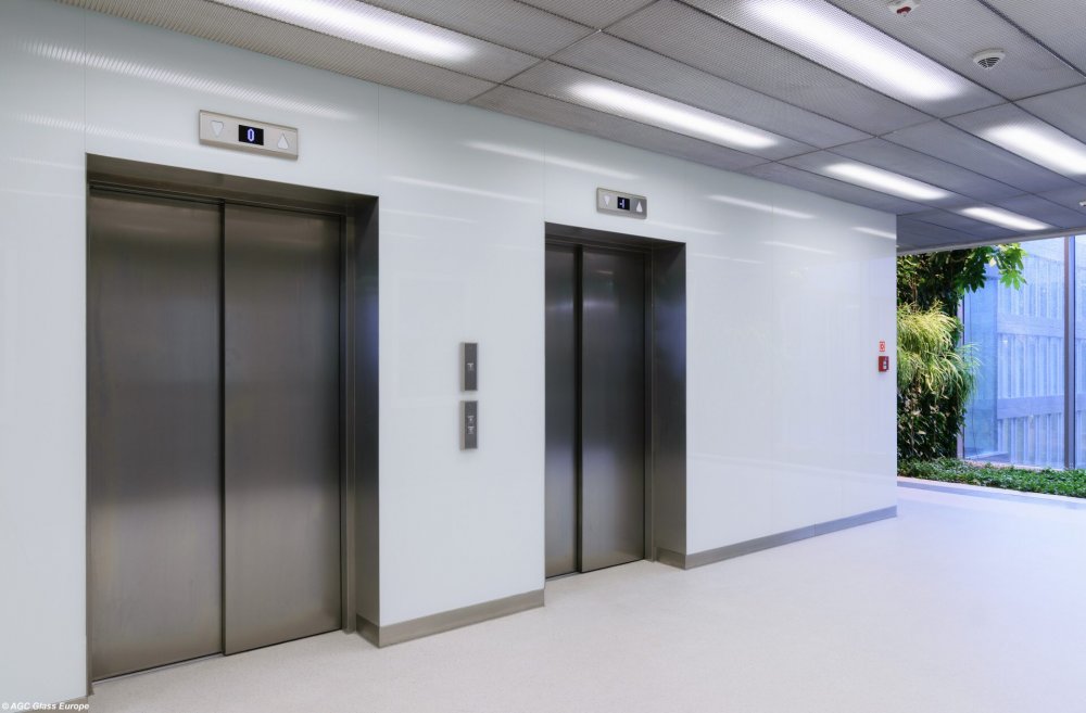 Skleněný obklad výtahu s lakovanými skly Lacobel White Pure