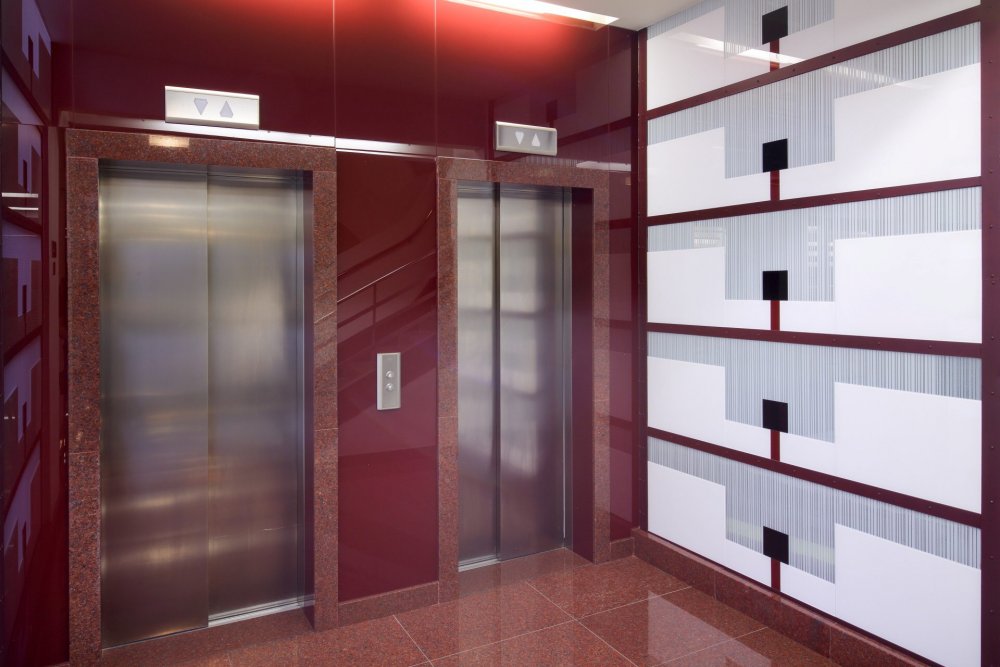 Skleněný obklad výtahů a stěny se skly Lacobel Dark Red