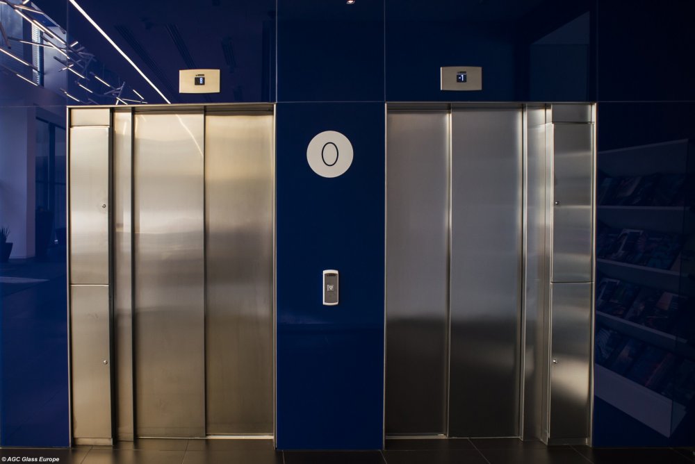 Skleněný obklad kolem výtahů Lacobel Blue Luminous