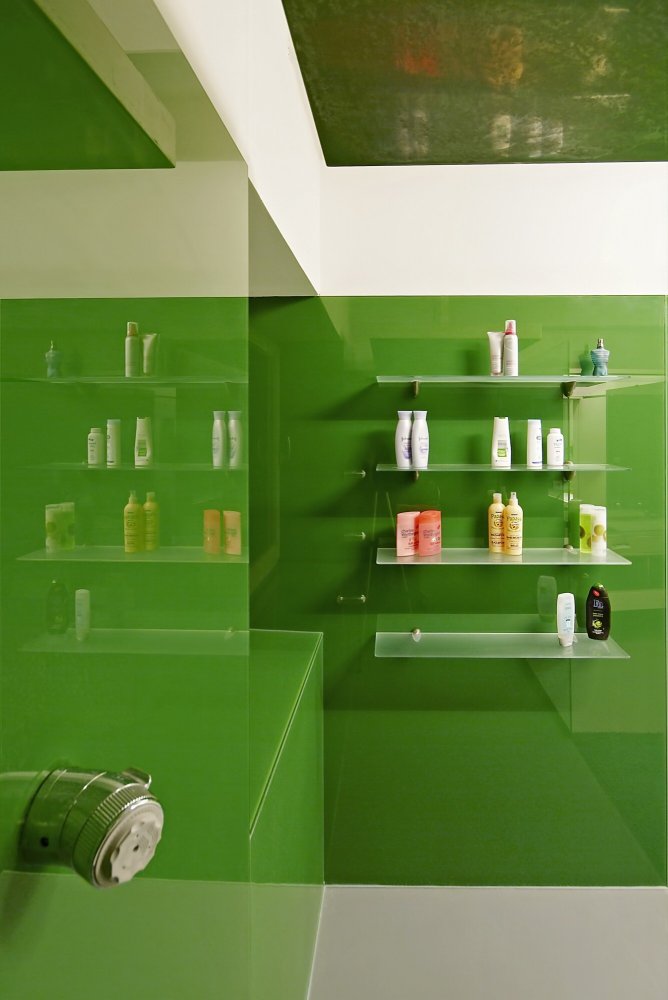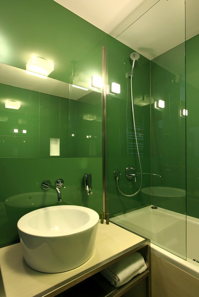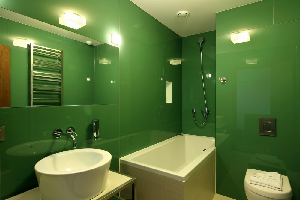 Skleněný obklad v koupelně Lacobel Green Jungle a zrcadlo Mirox MNGE Clear