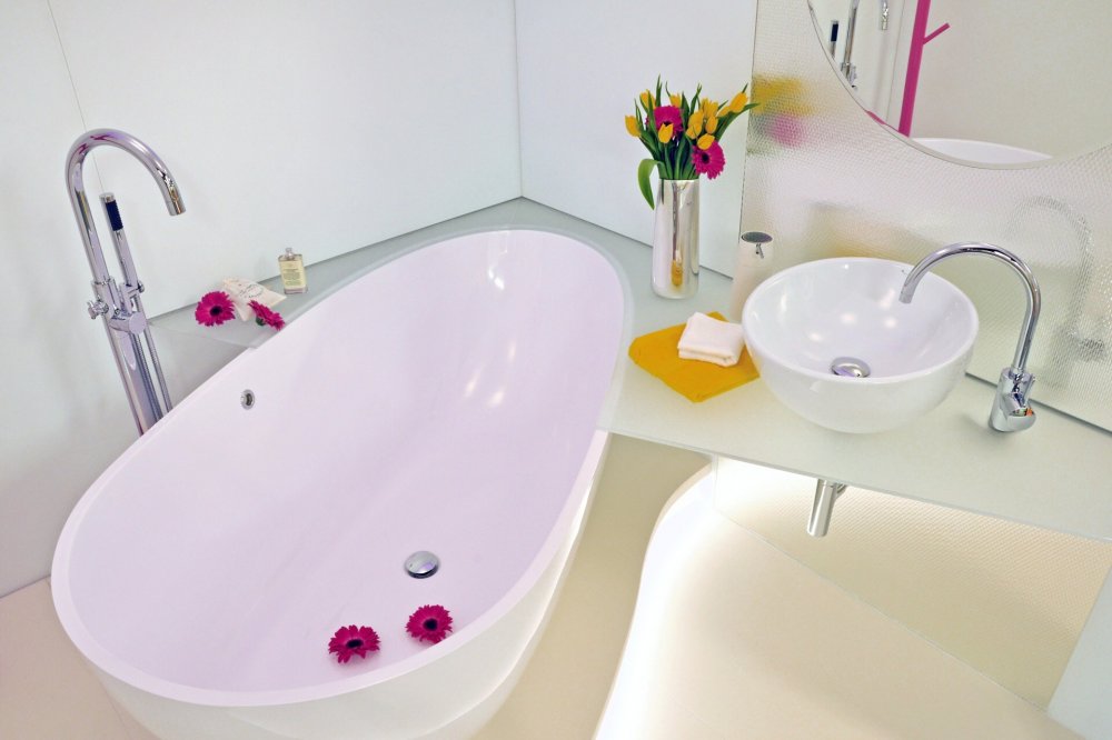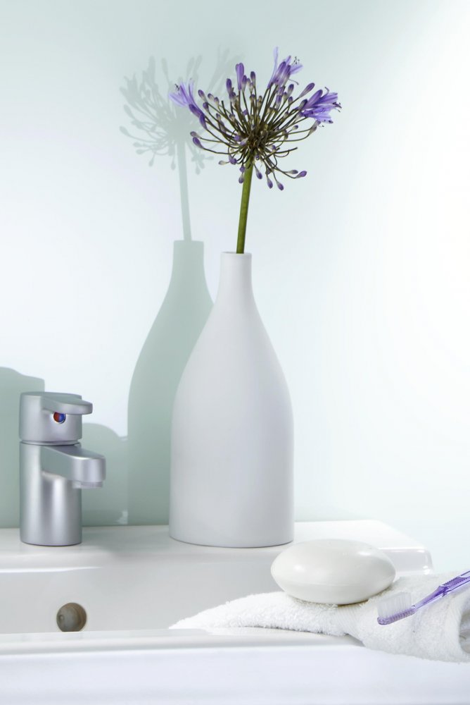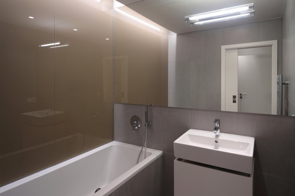 Koupelna s obkladem z lakovaného skla Lacobel White Soft