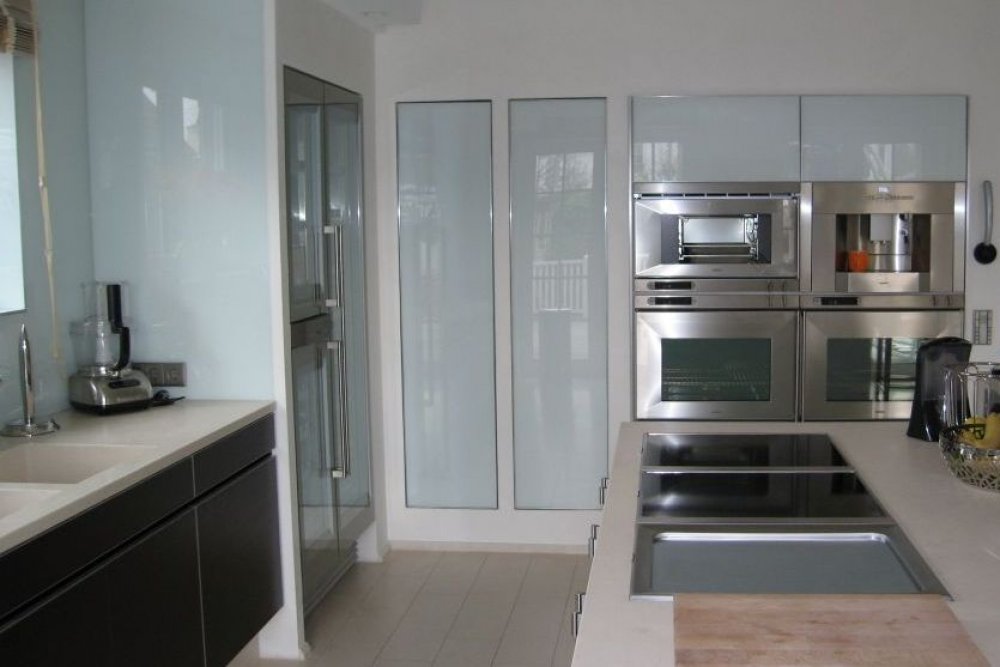 Kuchyňská dvířka ze skla Matelux Clear a skleněný obklad Lacobel Beige Light