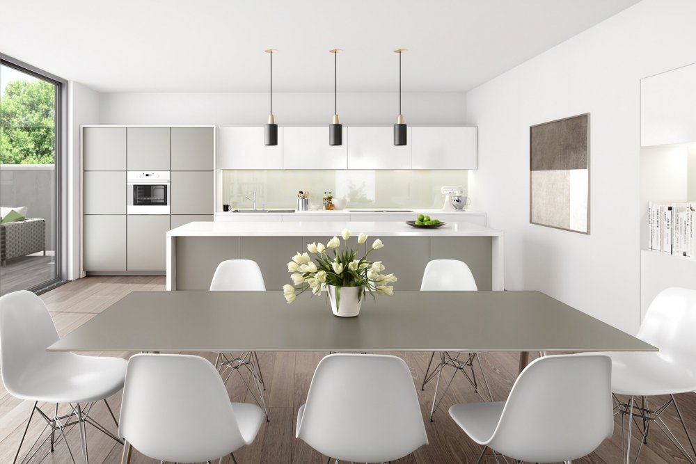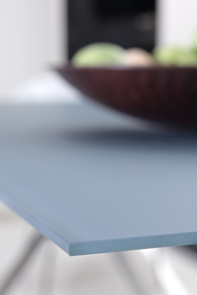 Kuchyňská dvířka z matovaného skla skla Matelux PrivaBlue a dělicí příčka ze skla Matelux Clear