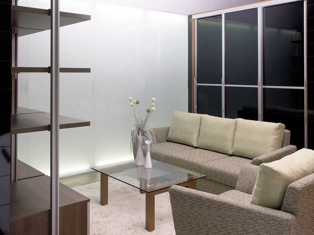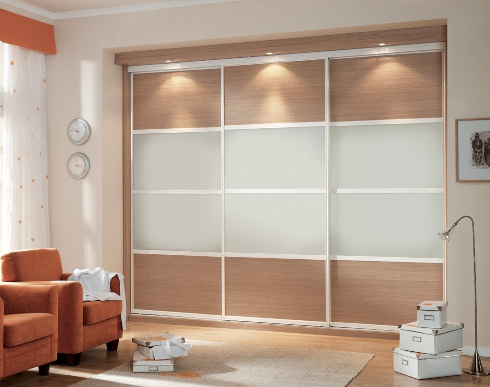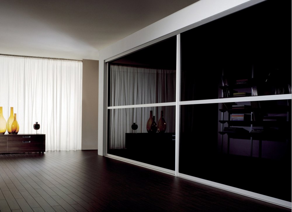 Vestavěná skříň z lakovaného lesklého skla Lacobel a lakovaného matného skla Matelac